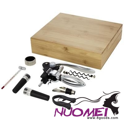 9-piece Wine Set Including 1 Corkscrew Bottle Opener, 2 Stoppers, 1 Pourer, 1 Ring, 1 Foil Cutter, 1 Thermometer, & 2 Spare Corkscrews. Delivered in a Bamboo Gift Box Sourced & Produced Following Sustainable Standards. Stainless Steel Metal, Bamboo Wood. Minimum Quantity: 500.