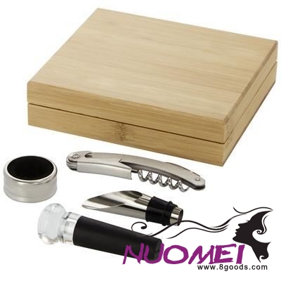 4-piece Wine Set Including a Waitress Corkscrew Bottle Opener, a Stopper, a Pourer & a Ring. Delivered in a Bamboo Gift Box Sourced & Produced Following Sustainable Standards. Stainless Steel Metal, Bamboo Wood. Minimum Quantity: 500.