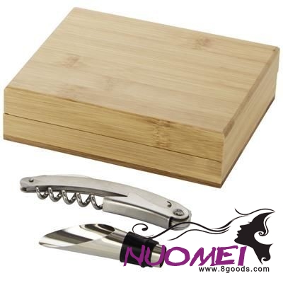 2-piece Wine Set Including a Waitress Corkscrew Bottle Opener & a Bottle Pourer. Delivered in a Bamboo Gift Box Sourced & Produced Following Sustainable Standards. Stainless Steel Metal, Bamboo Wood. Minimum Quantity: 500.