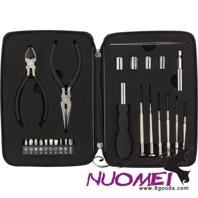 26Pc. Aluminium Metal & Steel Tool Set Including: Two Pinchers, One Holder with Nine Different Bits, an Adapter, Tweezers, Four Drive Sockets, an Adapter, a Black Handle, & Six Different Precision Tools; in a Zip Metal Case with Eva Foam Inlay.