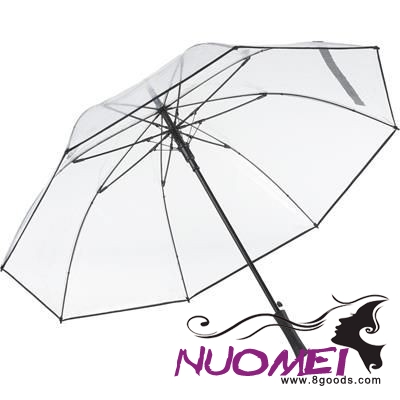 Attractive Automatic Golf Umbrella with Clear Transparent Cover & Colour Details. Convenient Automatic Function for Quick Opening, High-quality Windproof System for Maximum Frame Flexibility in Stormy Conditions, Flexible Fibreglass Ribs, Colour-coordinated Design Elements, Straight Matt Black Plastic Handle with Promotional Re Labelling Option, Higher Corrosion Protection Due to Galvanized Steel Shaft. Minimum Quantity: 1.